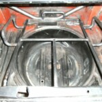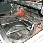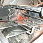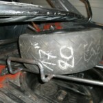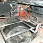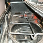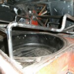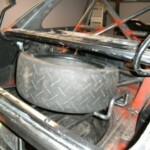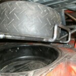 We welded a smal rack that was mounted above the petrol tank The spare wheel now slides in the trunk in its rack and can be locked.