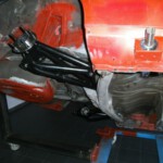 We maken een custom silentblock met 2 (ronde) T-vormige rubbers die op hun beurt op hun plaats worden gehouden door 2 alu zij-flenzen. (naar analogie met de motorsteunen) Deze silentblocks komen dan in de ronde Chromoly buis die vrij stevig op het chassis is gelast.